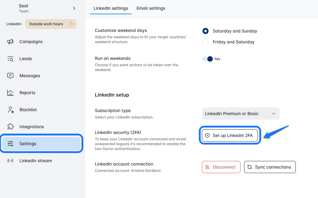 1. Open LinkedIn 2FA Settings in SalesBot ⚙️